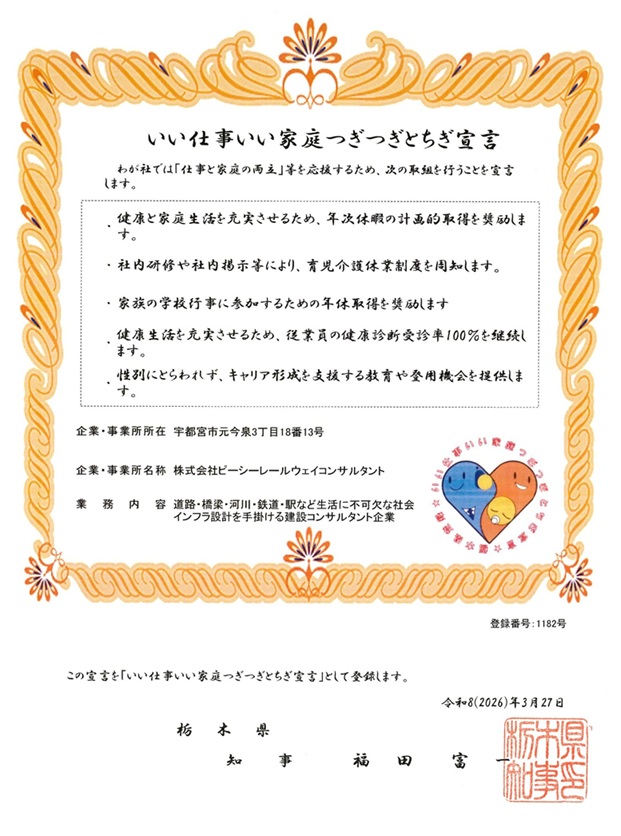 「いい仕事いい家庭つぎつぎとちぎ宣言」登録証